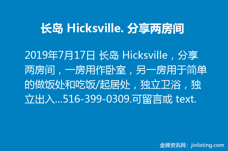 长岛 Hicksville. 分享两房间. 长岛 Hicksville,分享两房间,一房用作卧室,另一房用于简单的做饭处和吃饭/起居处,独立卫浴,独立出入,包水电暖气上网,交通方便,近火车站汽车站。适合单身女士. 联系电话:516-399-0309. 可留言或 text.