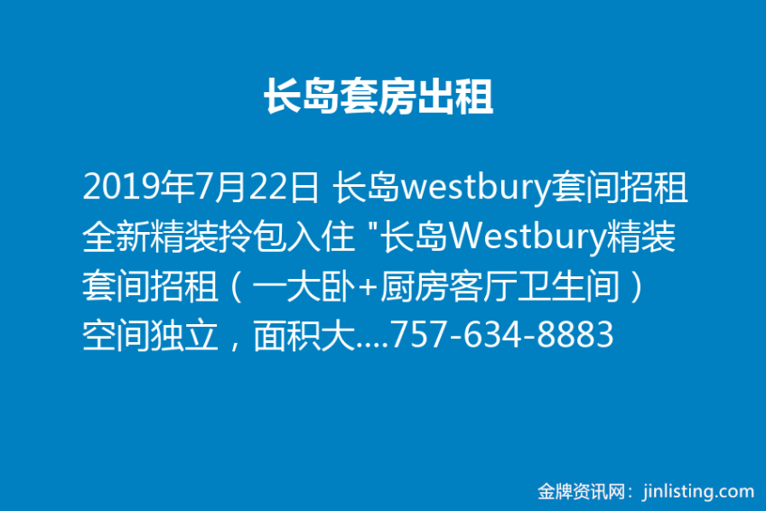 长岛westbury套间招租 全新精装拎包入住 “长岛Westbury精装套间招租(一大卧+厨房客厅卫生间)空间独立,面积大。可以步行到火车站,生活十分便利。全新装修,带全套新家具以及电器,中央空调冷暖气,居住舒适。附近很多中餐馆和超市,离Hmart, 新飞龙, 爱新鲜, 罗斯福mall商圈开车十分钟以内,距Hofstra Adelphi NYIT LIU十几分钟车程。希望找爱干净的小伙伴加入,要求不抽烟不养宠物,谢谢。 个人出租无中介费,不与房东同住,utilities每月50左右不会超过100。有兴趣请联系:手机757-634-8883或者加微信346485746”