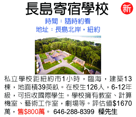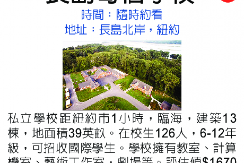 私立學校距紐約市1小時,建築13棟,地面積39英畝。在校生126人,6-12年級,可招收國際學生。學校擁有教室、計算機室、藝術工作室,劇場等。寄宿樓提供良好住宿空間,臨海環境好。評估值$1670萬,售$800萬。