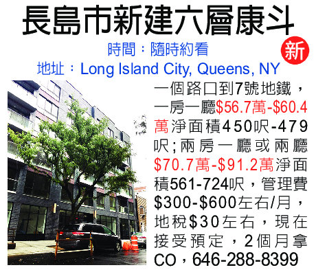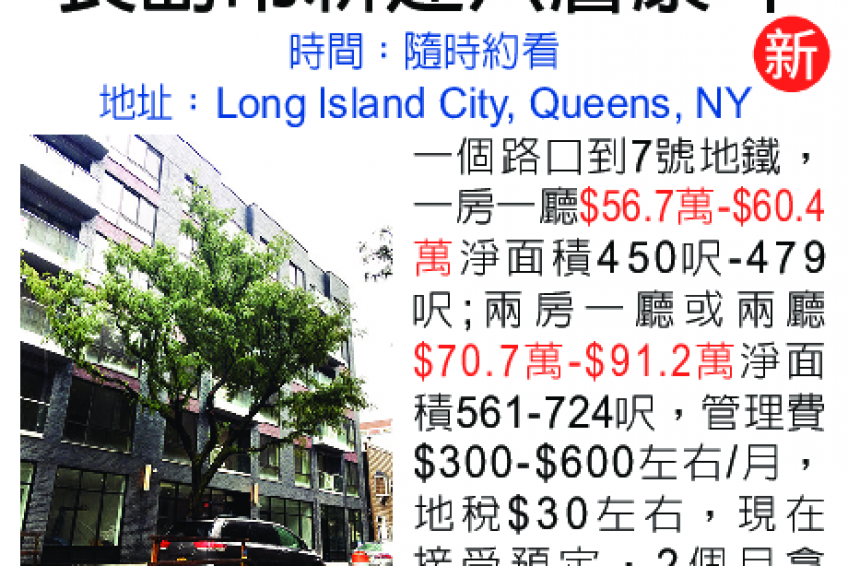 時間:隨時約看 地址:Long Island City, Queens, NY ,一個路口到7號地鐵,價格一房一廳$56.7萬~60.4萬(淨面積450呎~479呎),兩房一廳或兩廳70.7萬~91.2萬(淨面積561~724呎),管理費300~600左右每月,地稅30元左右,現在接受預定,2個月拿CO,數量有限!先到先得! 646-288-8399