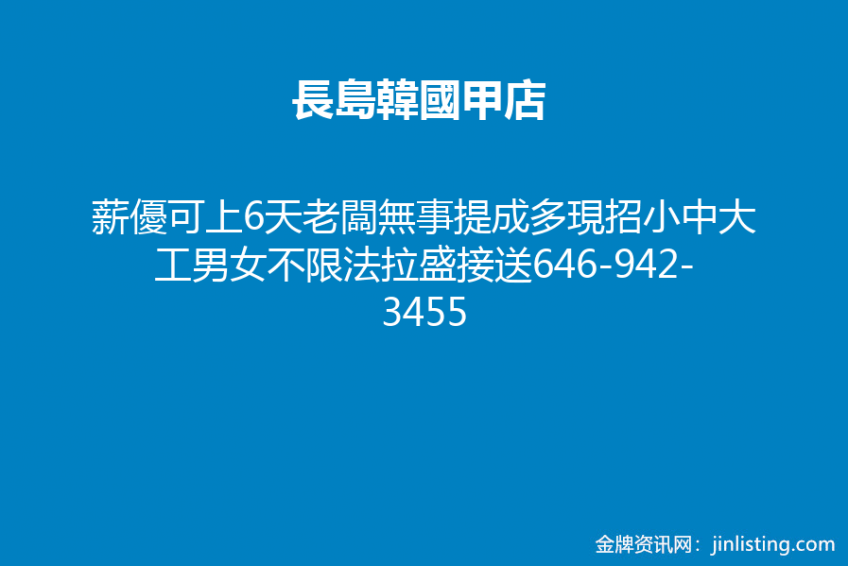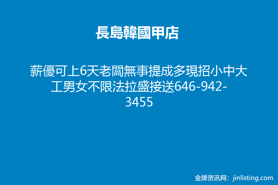 薪優可上6天老闆無事提成多現招小中大工男女不限法拉盛接送646-942-3455