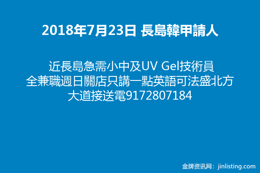 近長島急需小中及UV Gel技術員全兼職週日關店只講一點英語可法盛北方大道接送電9172807184
