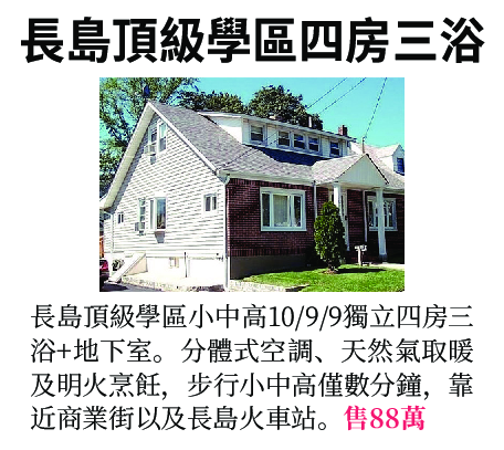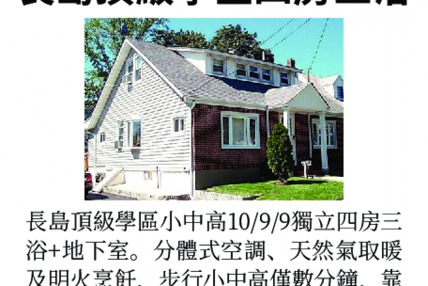 長島頂級學區小中高10/9/9獨立四房三浴+地下室。