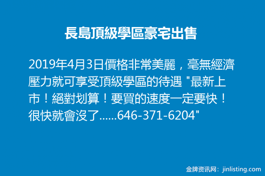 Syosset長島頂級學區豪宅出售 – 價格非常美麗,毫無經濟壓力就可享受頂級學區的待遇 “最新上市!絕對划算!要買的速度一定要快!很快就會沒了。請馬上聯繫Kiki 蔡小姐 646-371-6204 想要讓孩子享用到全美/全紐約都有排名的學區卻苦惱房價太貴?往這邊看來!一個絕好的機會讓你毫無經濟壓力給孩子提供最好的學習環境。 38 Edna Dr, Syosset 長島頂級學區超大一家庭 5 個超大臥室,2 大客廳,2 廚房,3 衛浴,2 試衣間,完成地下室。全新屋頂/車庫/地下室,室內裝潢選用高級材料。土地:70X150,屋子面積:3620 尺,地稅:$24,942/年(還可申請減免) 步行10 分鐘到長島火車站開車25 分鐘到皇后區步行到公園,超市,餐館,醫院,生活非常便利。 一個家庭卻有兩個廚房,一樓二樓地下室分別獨立出入口,非常適合大家庭住。在同個區域再也找不到類似的大房子了。 開價只要94.9萬!沒錯是94萬9!不看的話絕對會後悔! 歡迎經紀合作轉發。趕緊聯繫Kiki蔡小姐 646-371-6204”