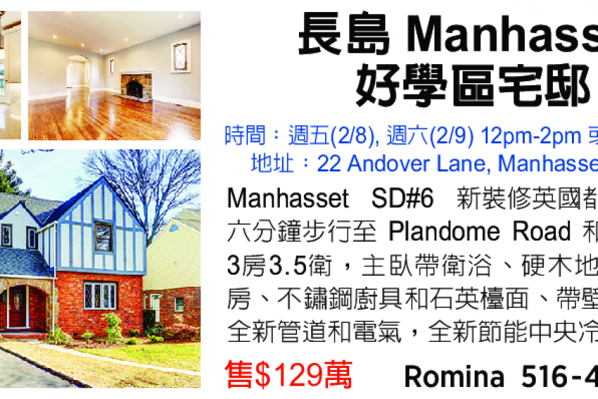 22 Andover Lane, Manhasset NY 11030 新裝修英國都鐸式宅邸。六分鐘步行至普蘭多姆路(Plandome Road)和長島鐵路。 Manhasset SD#6學區。帶衛浴的主人房、硬木地板、全新廚房、不鏽鋼廚具和石英檯面、帶壁爐的客廳。全新管道和電氣,全新省能源中央冷暖氣系統。售$129萬