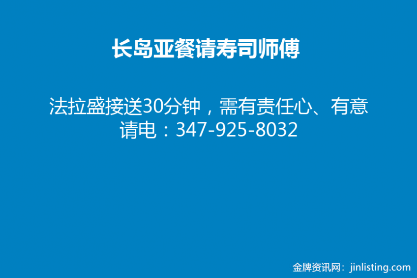 长岛亚餐请寿司师傅、、 法拉盛接送30分钟,需有责任心、有意请电:347-925-8032