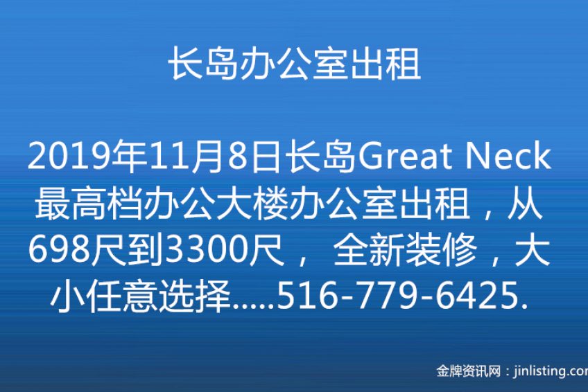 长岛Great Neck 最高档办公大楼办公室出租, 从698尺到3300尺, 全新装修,大小任意选择,免费大型停车场,可以走到长岛火车站和多条公车站,交通极为方便,大楼底层就是银行,附近有多个中餐厅和西餐厅,咖啡店,面包店,超级市场等等,非常的便利,每尺只要$38, 可以商量价格,非常的有格调和气派, 是您办公的首选之地, 约看请电: 516-779-6425.