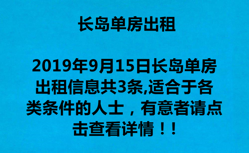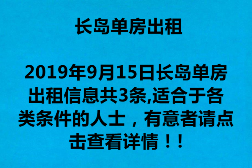 1.长岛41口 Jericho 杰里科 单房出租 长岛Jericho杰里科优秀区 独立House分租单房。 近495高速 易趴车安全区 步行3分钟巴士站,区内全美名列前茅的小学、初高中,附近多个超市 邮局银行尽有 步行可及。屋内干净整洁带衣橱 提供双人床 两窗向阳 大卫生间近乎独享 包水电网冷暖气 房主奶奶孙女两人 意租女性单身 ,母女、母子。联系电话:(929)382-1903