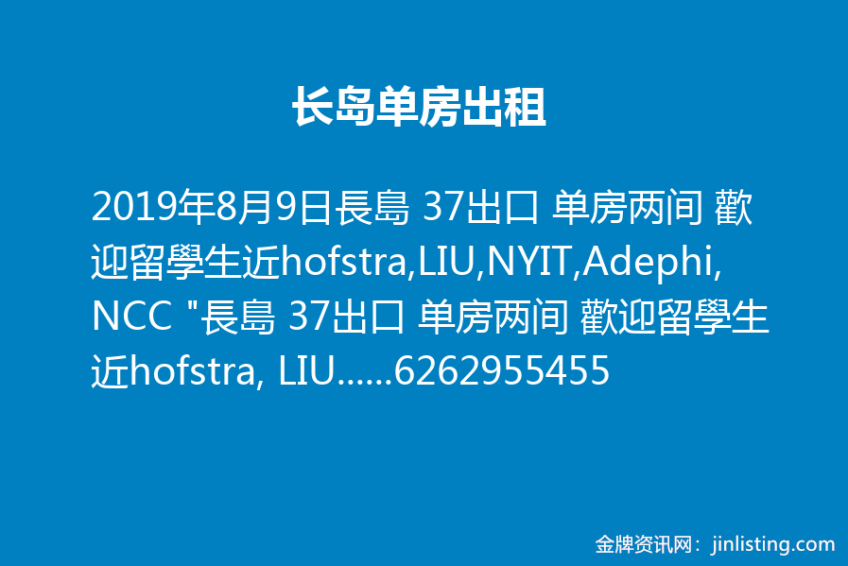長島 37出口 单房两间 歡迎留學生近hofstra, LIU, NYIT, Adephi, NCC “長島 37出口 单房两间 歡迎留學生近hofstra, LIU, NYIT, Adephi, NCC hofstra, LIU, NYIT, Adephi, LIU, C.W.Post 長島大學,NYIT 紐約理工學院 , NCC 警察局、郵局、圖書館,shopping mall, Manhasset 购物中心,BJ, COsco, Walmart 开车都是10分钟左右路程 价格全包650.750可以马上入住。家具齐全。 联系电话6262955455 接不到电话请短信,我会回复你。”