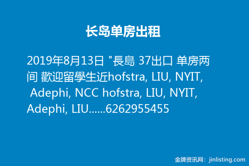 “長島 37出口 单房两间 歡迎留學生近hofstra, LIU, NYIT, Adephi, NCC hofstra, LIU, NYIT, Adephi, LIU, C.W.Post 長島大學,NYIT 紐約理工學院 , NCC 警察局、郵局、圖書館,shopping mall, Manhasset 购物中心,BJ, COsco, Walmart 开车都是10分钟左右路程 价格全包650.750可以马上入住。家具齐全。 联系电话6262955455 接不到电话请短信,我会回复你。”