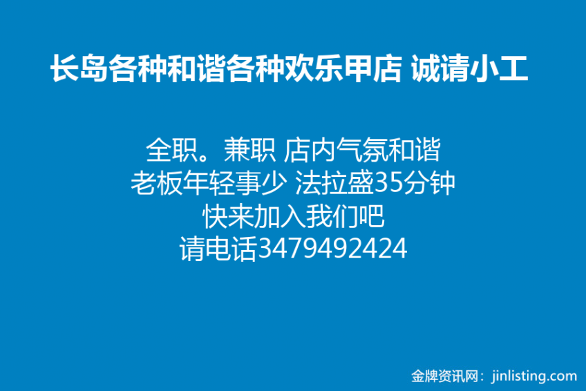 长岛各种和谐各种欢乐甲店 诚请小工 全职。兼职 店内气氛和谐 老板年轻事少 法拉盛35分钟 快来加入我们吧 请电话☎3479492424
