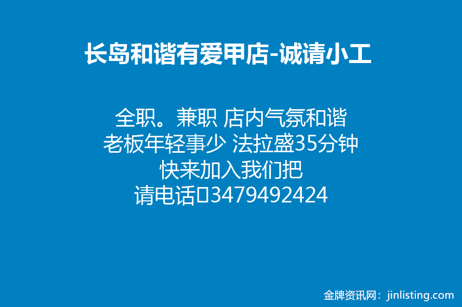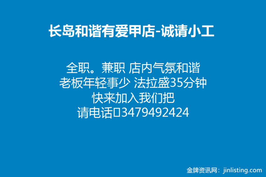 长岛和谐有爱甲店 诚请小工 全职。兼职 店内气氛和谐 老板年轻事少 法拉盛35分钟 快来加入我们把 请电话☎3479492424