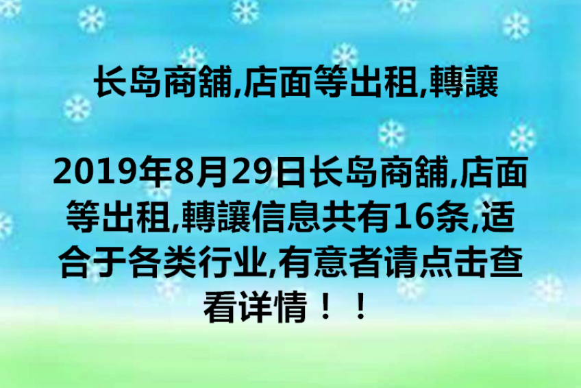 长岛甲店转让 长岛好区 3脚池 4手台 1拔毛房 月租$2000. 地处商业街 有免费停车场 现低价转让 投资少回本快 欢迎看店议价 ☎:917-723-7881 非诚勿扰。