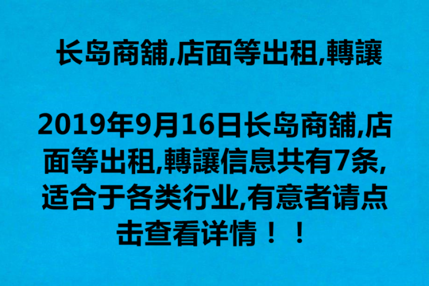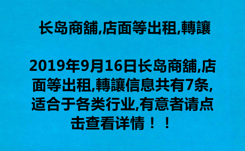 6. 长岛正规按摩店转让@ “店面位于离法拉盛三十分钟的车程,将近十年的店,白人区,大费高,小费好。面积1250尺,还有地下室。五床三脚椅。因为本人要急需岀国,忍痛转让。详情请联系 ☎️9176006877”