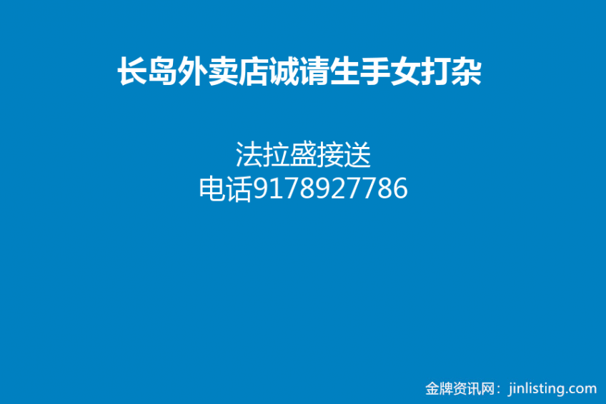 长岛外卖店诚请生手女打杂,法拉盛接送 电话9178927786