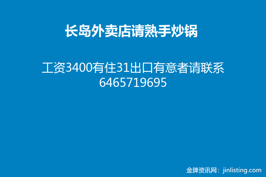 长岛外卖店请熟手炒锅,31出口有意者请联系6465719695工资3400有住