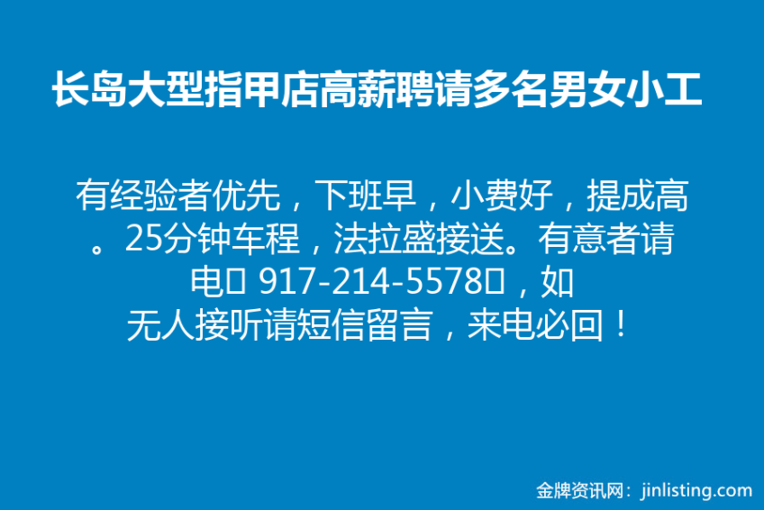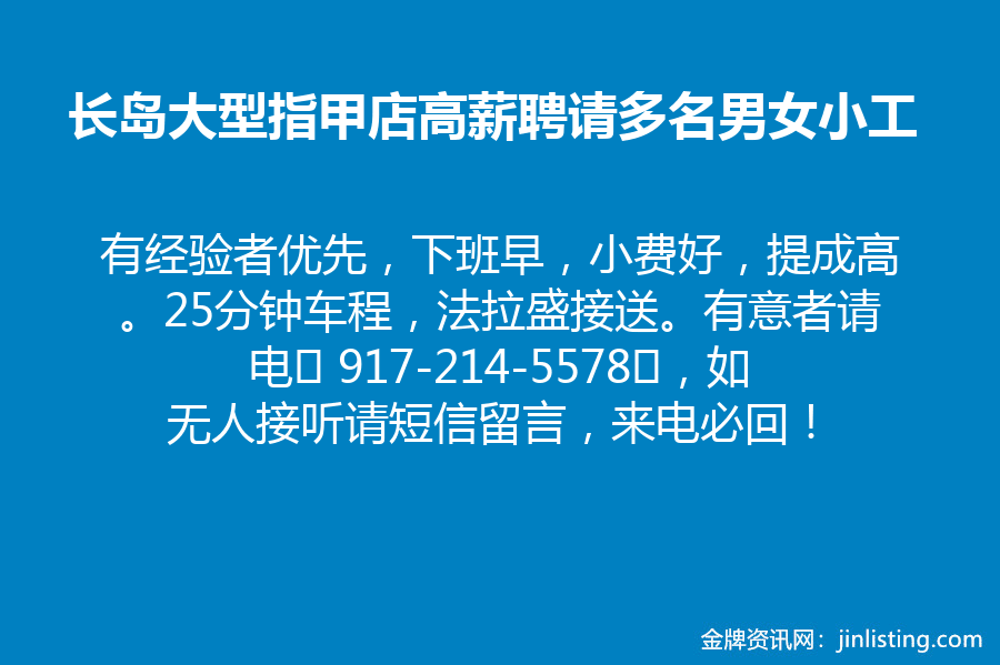 长岛大型指甲店高薪聘请多名男女小工,有经验者优先,下班早,小费好,提成高。25分钟车程,法拉盛接送。有意者请电‭ 917-214-5578‬,如无人接听请短信留言,来电必回!