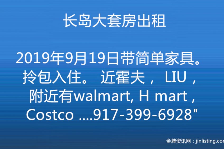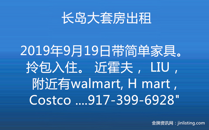 “长岛大套房出租, 带简单家具。拎包入住。 近霍夫, LIU,附近有walmart, H mart , Costco . 罗斯福mall。 开车到中超10来分钟。 到法拉盛30来分钟。 意者电:917-399-6928”
