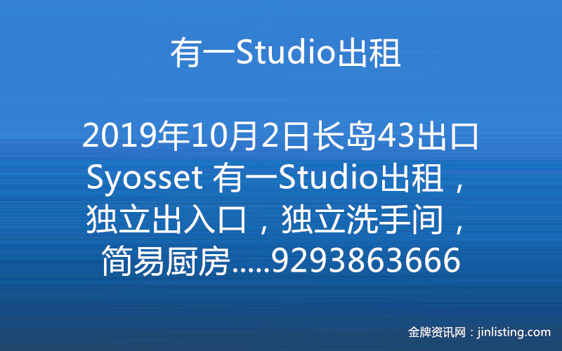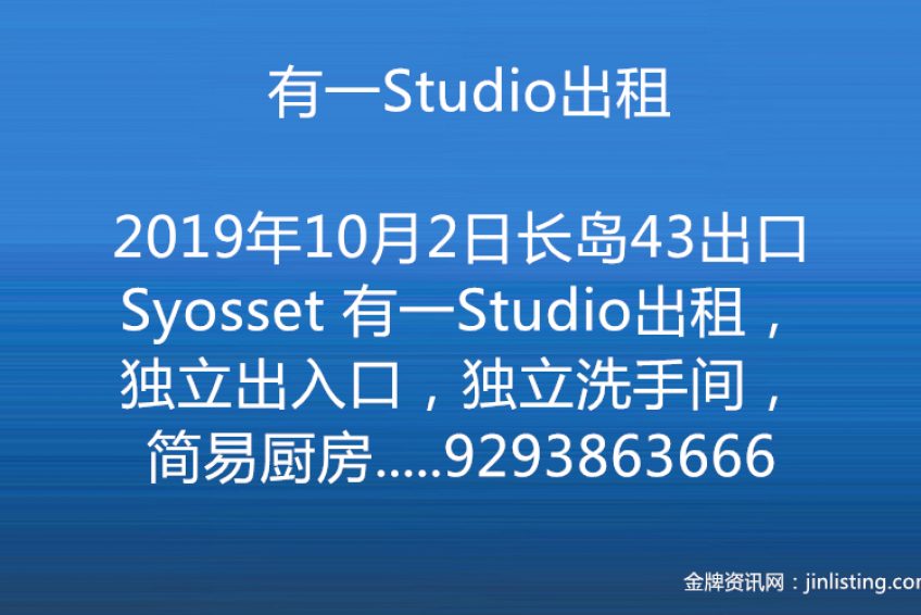 长岛43出口Syosset 有一Studio出租,独立出入口,独立洗手间,简易厨房,专用停车位,超好社区,400呎 ☎️9293863666