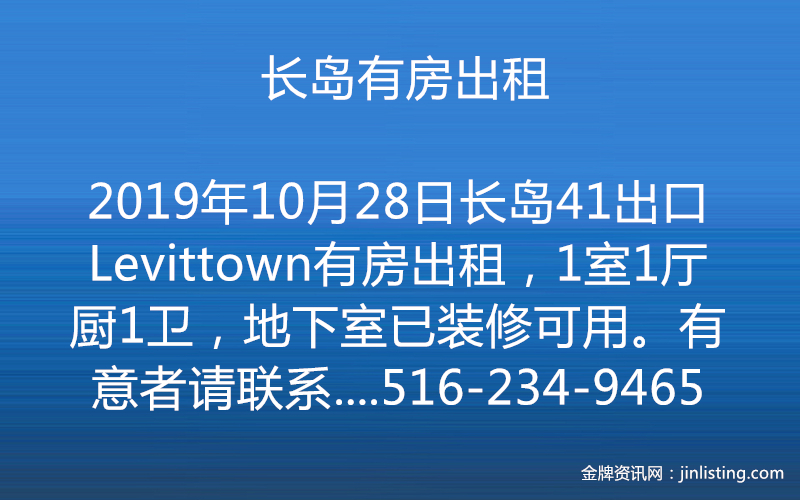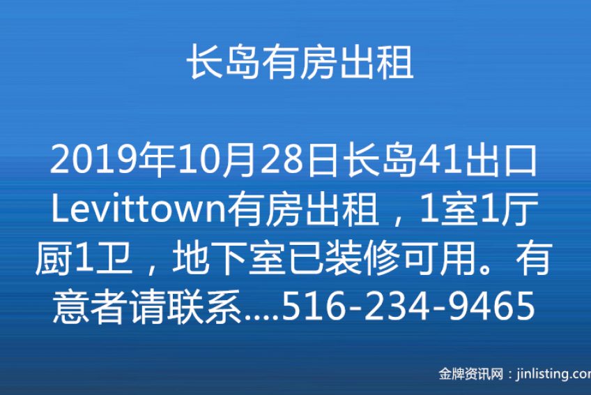 长岛41出口Levittown有房出租,1室1厅1厨1卫,地下室已装修可用。有意者请联系:袁女士 电话☎️516-234-9465