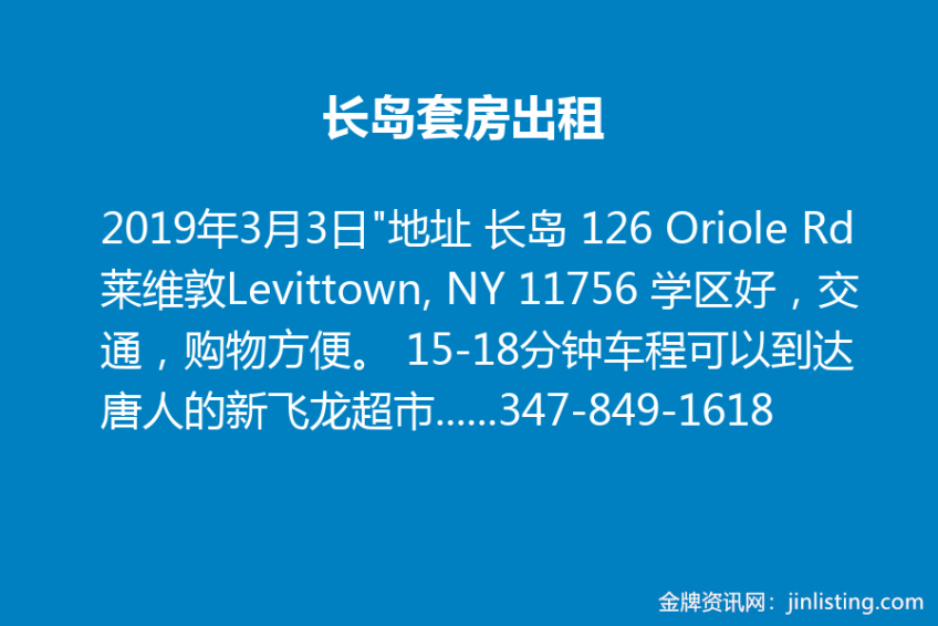 “地址 长岛 126 Oriole Rd 莱维敦Levittown, NY 11756 学区好,交通,购物方便。 15-18分钟车程可以到达唐人的新飞龙超市和爱新鲜超市。 自驾35-45分钟到达法拉盛。 中央暖冷。 三房,一厨,一卫。新厨房,新冰箱,新炉头。 可以分租 有意者请电:347-849-1618 929-364-3238”