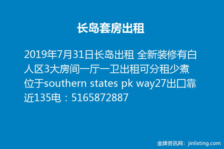 长岛出租 全新装修有白人区3大房间一厅一卫出租可分租少煮位于southern states pk way27出囗靠近135电:5165872887