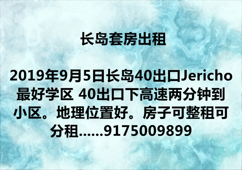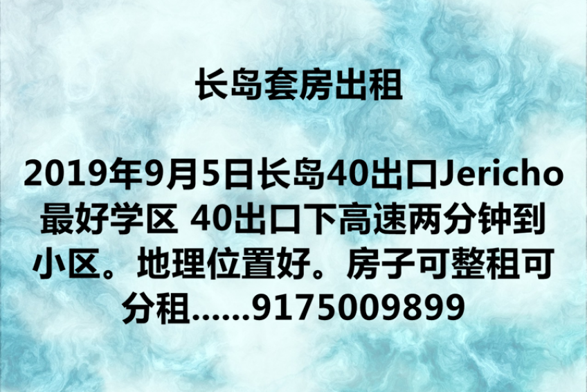 长岛40出口Jericho最好学区 40出口下高速两分钟到小区。地理位置好。房子可整租可分租。三房三卫。新装修,分租有大小三个房间。每个房间旁边都配独立卫生间浴室。生活环境好。小区内配健身房。游泳池。网球场。适合爱干净的小家庭。母子,学生。在附近打工的人。联系9175009899隋先生2129458523张女士