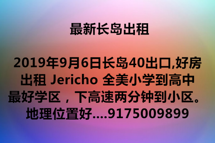 长岛40出口。好房出租 【最新长岛出租】Jericho 长岛40E出口,全美小学到高中最好学区,下高速两分钟到小区。地理位置好,距离各大超市驱车10几分钟,包括costco,BJ, IKEA, Macy等。房东分租。一共两家庭,每户三房三卫。装修好,每个家庭使用面积2800尺左右,每户都是双车位停车,小区有24小时门卫,安全级别一流,需要自己带家具。可以独立出租或者分租可选择有大小三个房间。每个房间旁边都配卫生间浴室。生活环境好。小区内配健身房。游泳池。网球场,篮球场,棋牌室,娱乐室,乒乓球室等高档设施。适合爱干净的小家庭。适合高薪家庭或母子就读。租金5000左右,分租价格详谈。联系电话:9175009899 隋先生