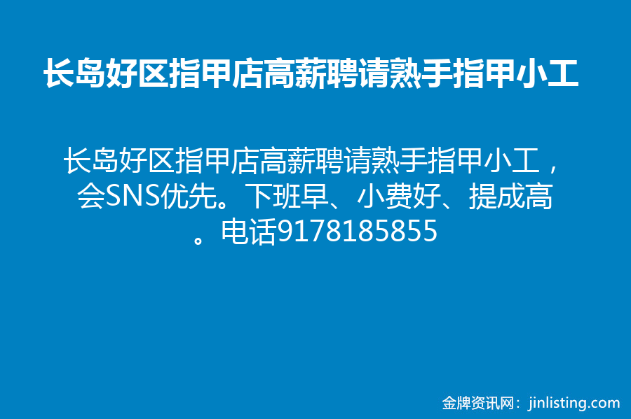 长岛好区指甲店高薪聘请熟手指甲小工,会SNS优先。下班早、小费好、提成高。电话9178185855
