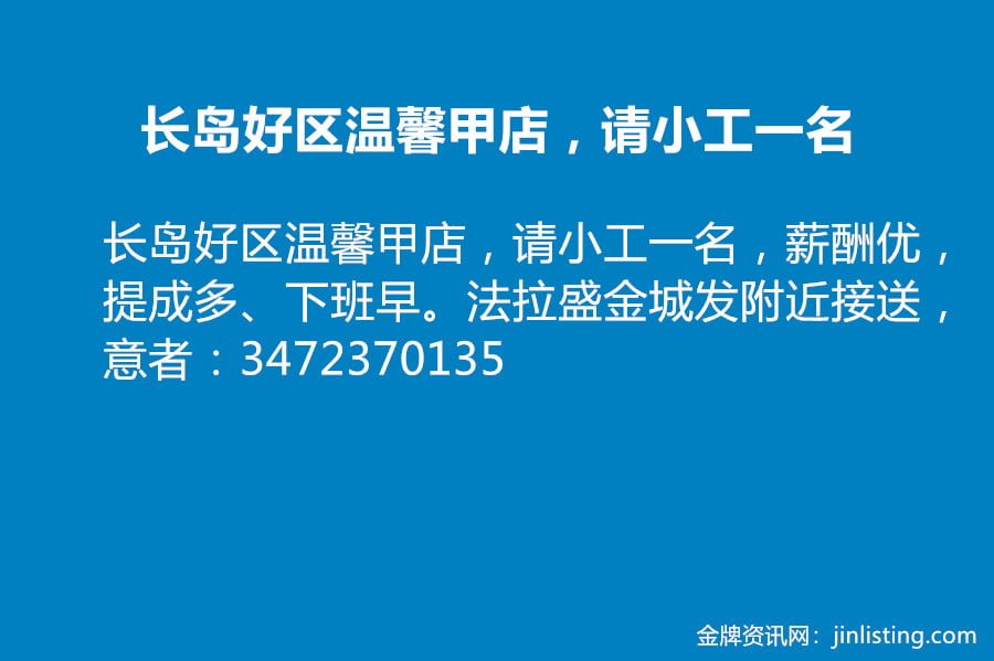 长岛好区温馨甲店,请小工一名,薪酬优,提成多、下班早。法拉盛金城发附近接送,意者:3472370135