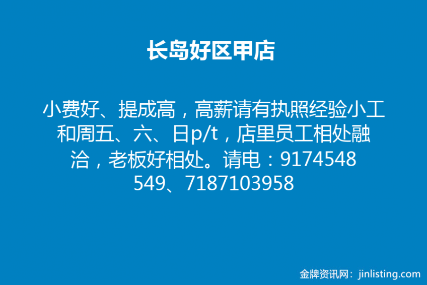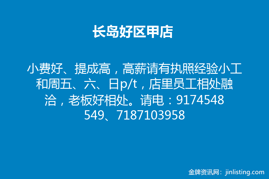 长岛好区甲店,小费好、提成高,高薪请有执照经验小工和周五、六、日p/t,店里员工相处融洽,老板好相处。请电:9174548549、7187103958