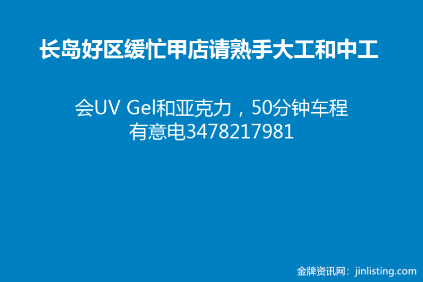 长岛好区缓忙甲店请熟手大工和中工,会UV Gel和亚克力,50分钟车程有意电3478217981