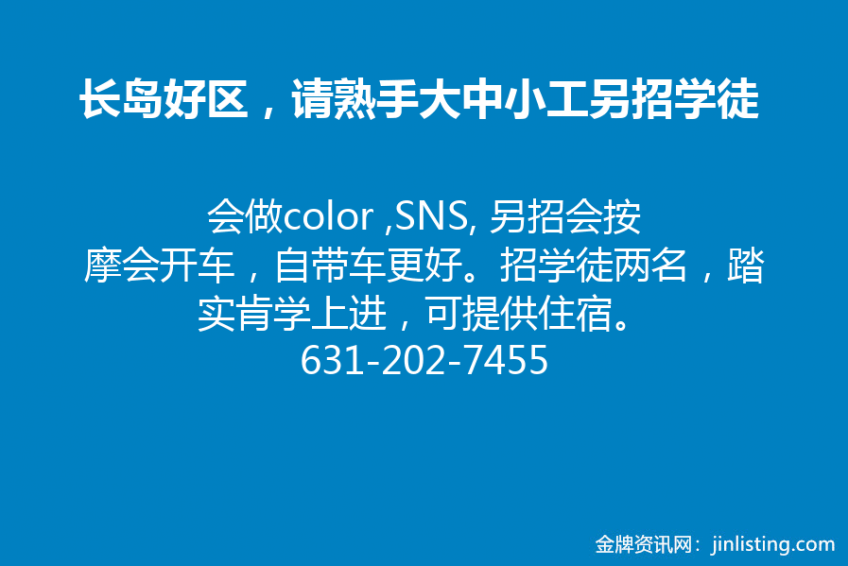 长岛好区,工作环境好,不做臭粉,老板员工和睦相处,招ft/pt熟手大工,中工,小工,会做color ,SNS, 另招会按摩会开车,自带车更好。招学徒两名,踏实肯学上进,可提供住宿。 631-202-7455,若未接电话,请发短信,谢谢。”