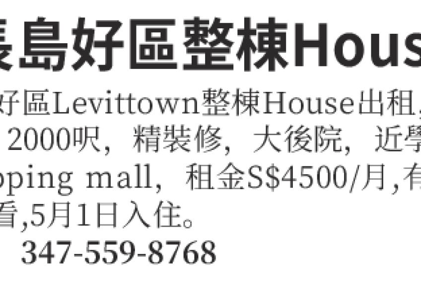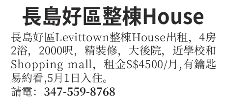 长岛好区Levittown整栋House出租 4房2浴 2000尺