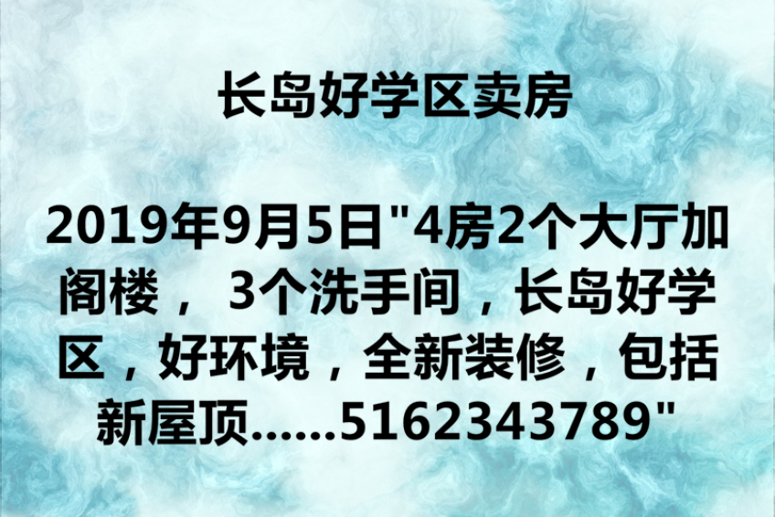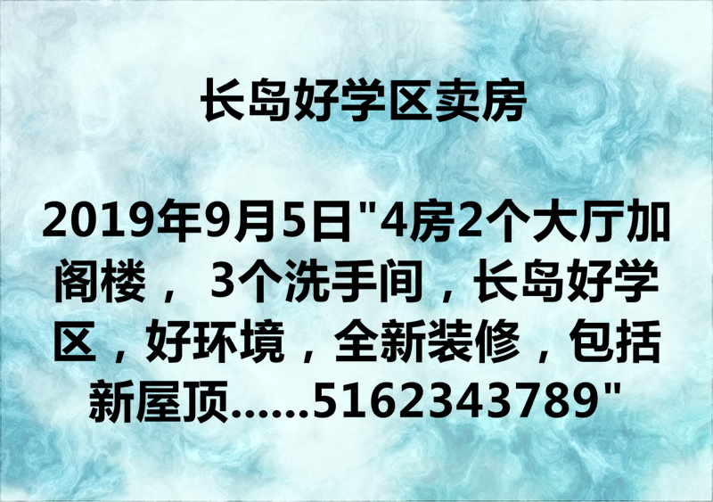 “4房2个大厅加阁楼, 3个洗手间,长岛好学区,好环境,全新装修,包括新屋顶,新地板,新窗户,新厨房,新的电器设备等,全新房一样。 新走路3分钟到长岛火车站(Gibson 火车站),离法拉盛30分钟车程,卖价:$648,000 联系电话;5162343789”