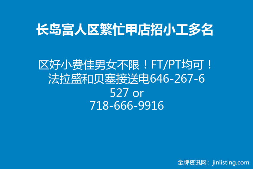 长岛富人区繁忙甲店招小工多名!区好小费佳!男女不限!FT or PT均可!法拉盛和贝塞接送 ☎☎电646-267-6527 or 718-666-9916