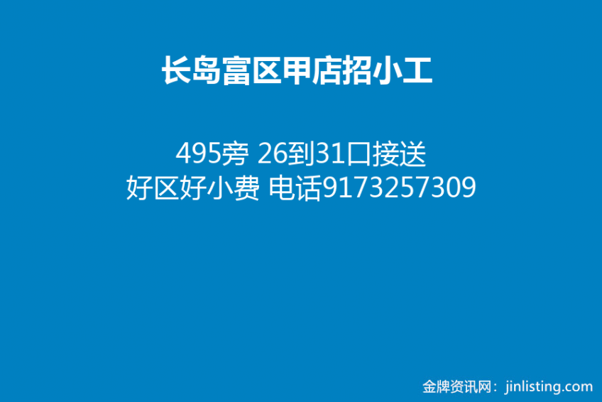 长岛富区甲店招小工 495旁 26到31口接送 好区好小费 电话9173257309