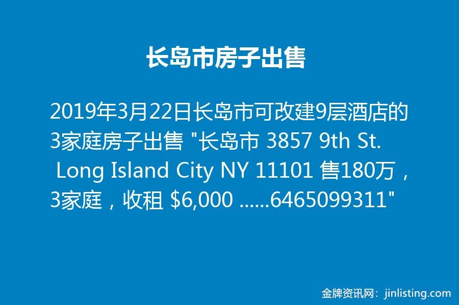 长岛市可改建9层酒店的3家庭房子出售 “长岛市 3857 9th St. Long Island City NY 11101 售180万,3家庭,收租 $6,000 可建酒店,9层 37个房间 联系电话 6465099311”
