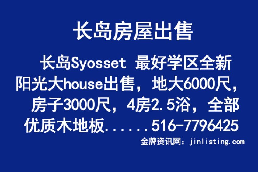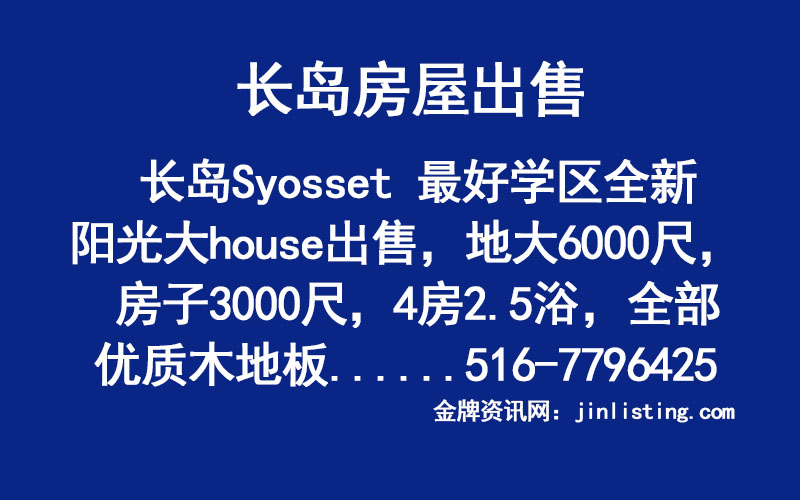 “长岛Syosset 最好学区全新阳光大house出售,地大6000尺, 房子3000尺,4房2.5浴, 全部优质木地板,车库和车道,交通方便,近超市和餐厅,银行等等,千万别错过了,只要118万8千. 全新的!全新的!全新的! 重要的事情讲三遍。