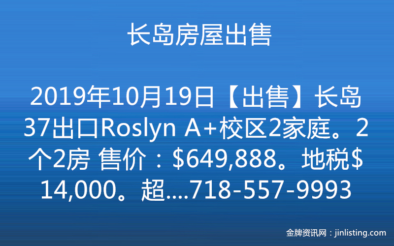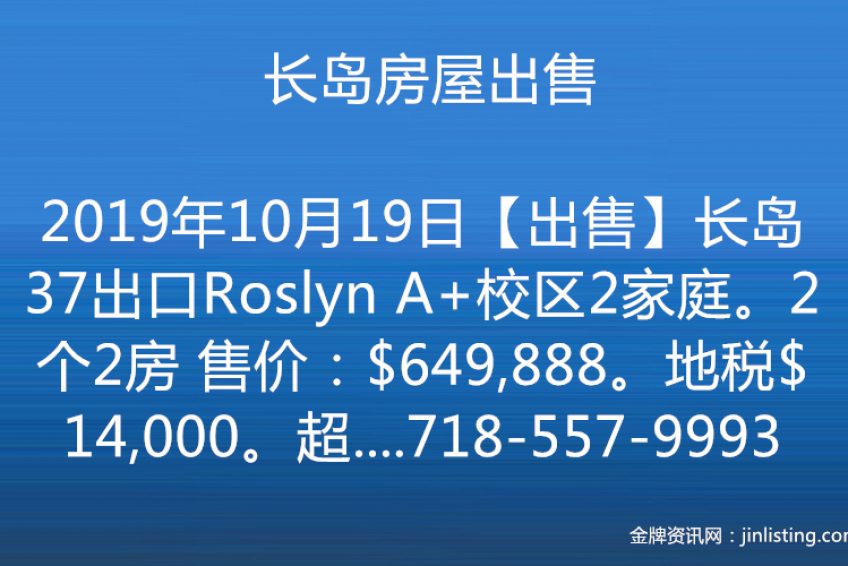 【出售】 长岛37出口Roslyn A+校区2家庭。2个2房 售价:$649,888。地税$14,000。超大地:50×125。近购物,生活交通便利。学区仅次于Jericho与Syosset。15分钟开车到法拉盛。适合投资自住,好学区,易出租。预约看房请电顺成地产 施先生。电话: 718-557-9993 微信:7185579993