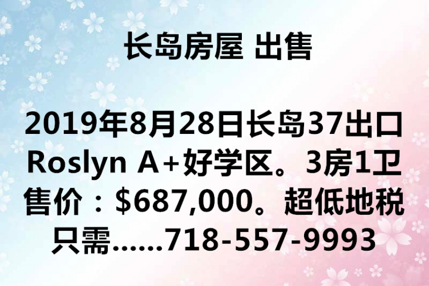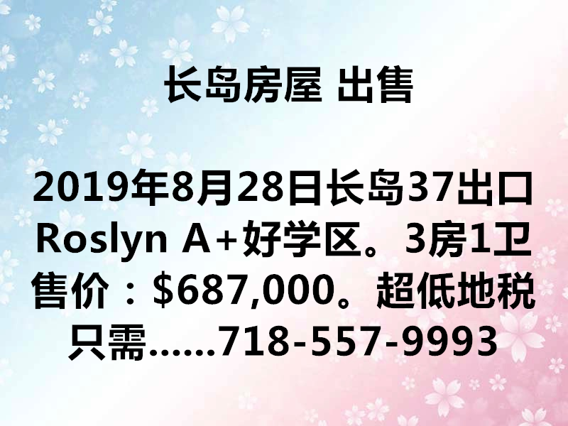 长岛37出口Roslyn A+好学区。3房1卫售价:$687,000。超低地税只需$5,500。地:39×130。近购物,生活交通便利。学区仅次于Jericho与Syosset。15分钟开车到法拉盛。预约看房请电顺成地产施先生。电话:718-557-9993 微信:7185579993