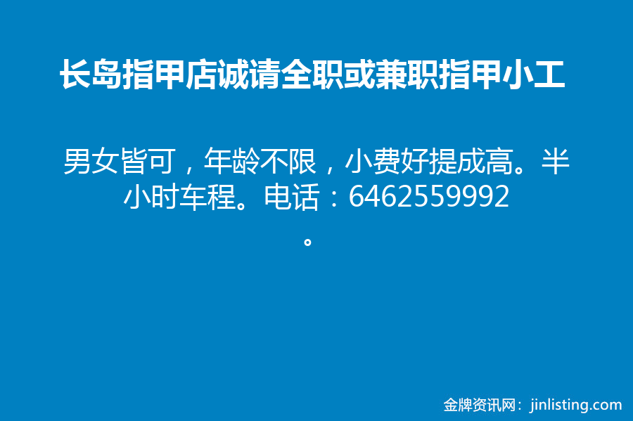 长岛指甲店诚请全职或兼职指甲小工,男女皆可,年龄不限,小费好提成高。半小时车程。电话:6462559992。
