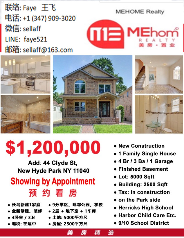 长岛新建全新装修一家庭,拎包入住,4卧室/3卫,2层+地下室+一车库,120万,5000平方尺