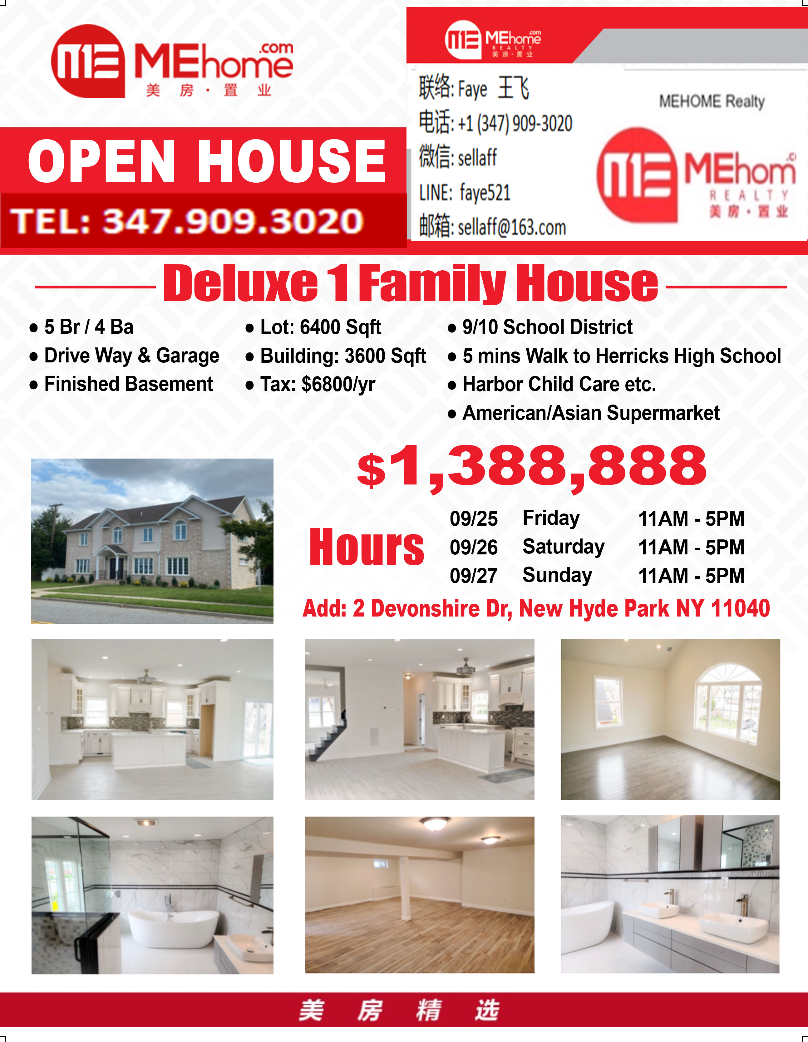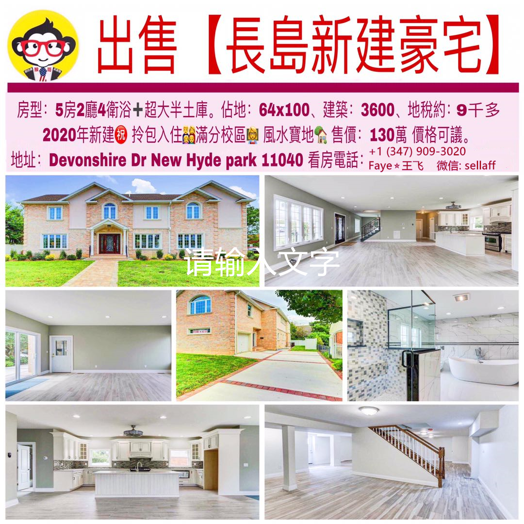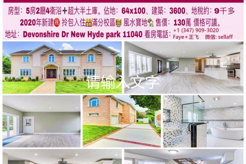房型:5房4厅4卫浴+超大半土库 土地占地:64*100 建筑面积: 3600 地税约:9千多 领包入住,满分校区🧒,风水宝地, 售价:138万 地址: Devonshire Dr New Hyde park 11040