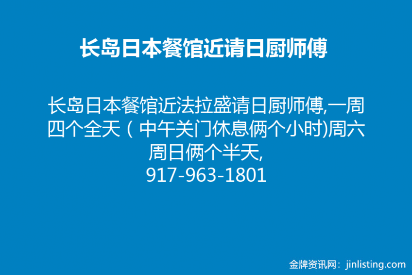长岛日本餐馆近法拉盛请日厨师傅917-963-1801 “一周四个全天(中午关门休息俩个小时)