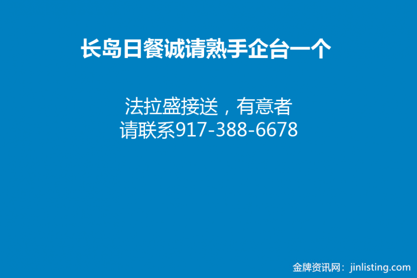 长岛日餐诚请熟手企台一个,法拉盛接送,有意者请联系917-388-6678!