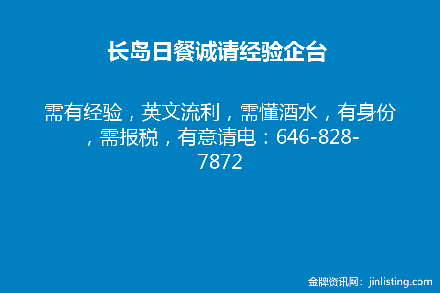 长岛日餐诚请经验企台 :646-828-7872