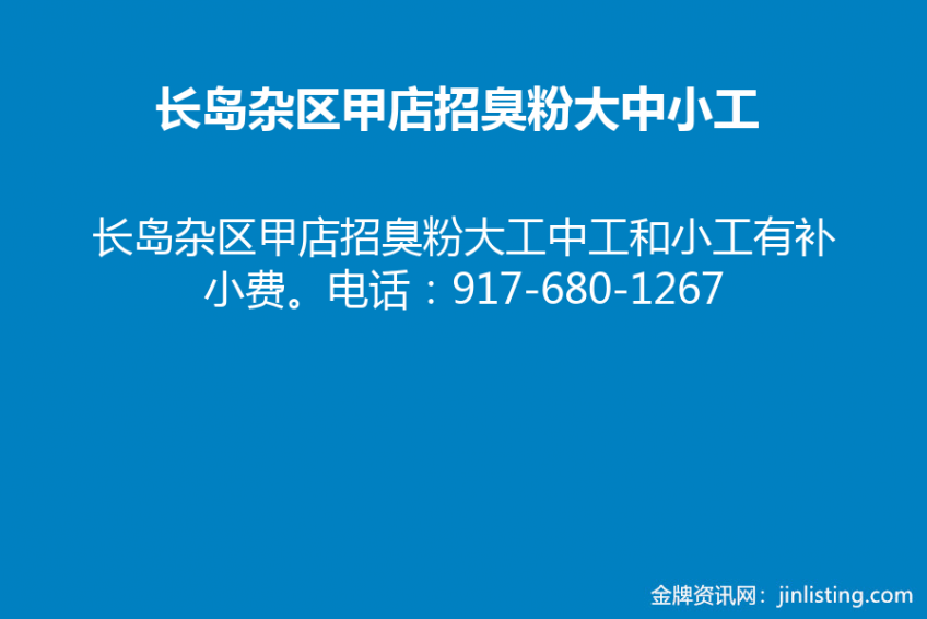 长岛杂区甲店招臭粉大工、中工和小工有补小费。电话:917-680-1267