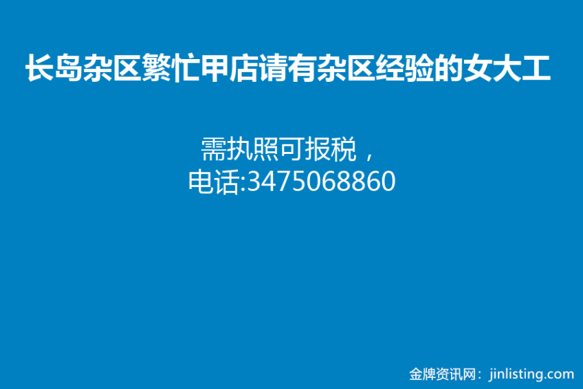 长岛杂区繁忙甲店请有杂区经验的女大工,需执照可报税,电话:3475068860
