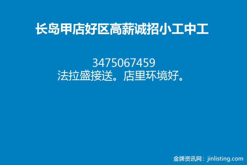 长岛甲店好区高薪诚招小工中工 3475067459 法拉盛接送。店里环境好。